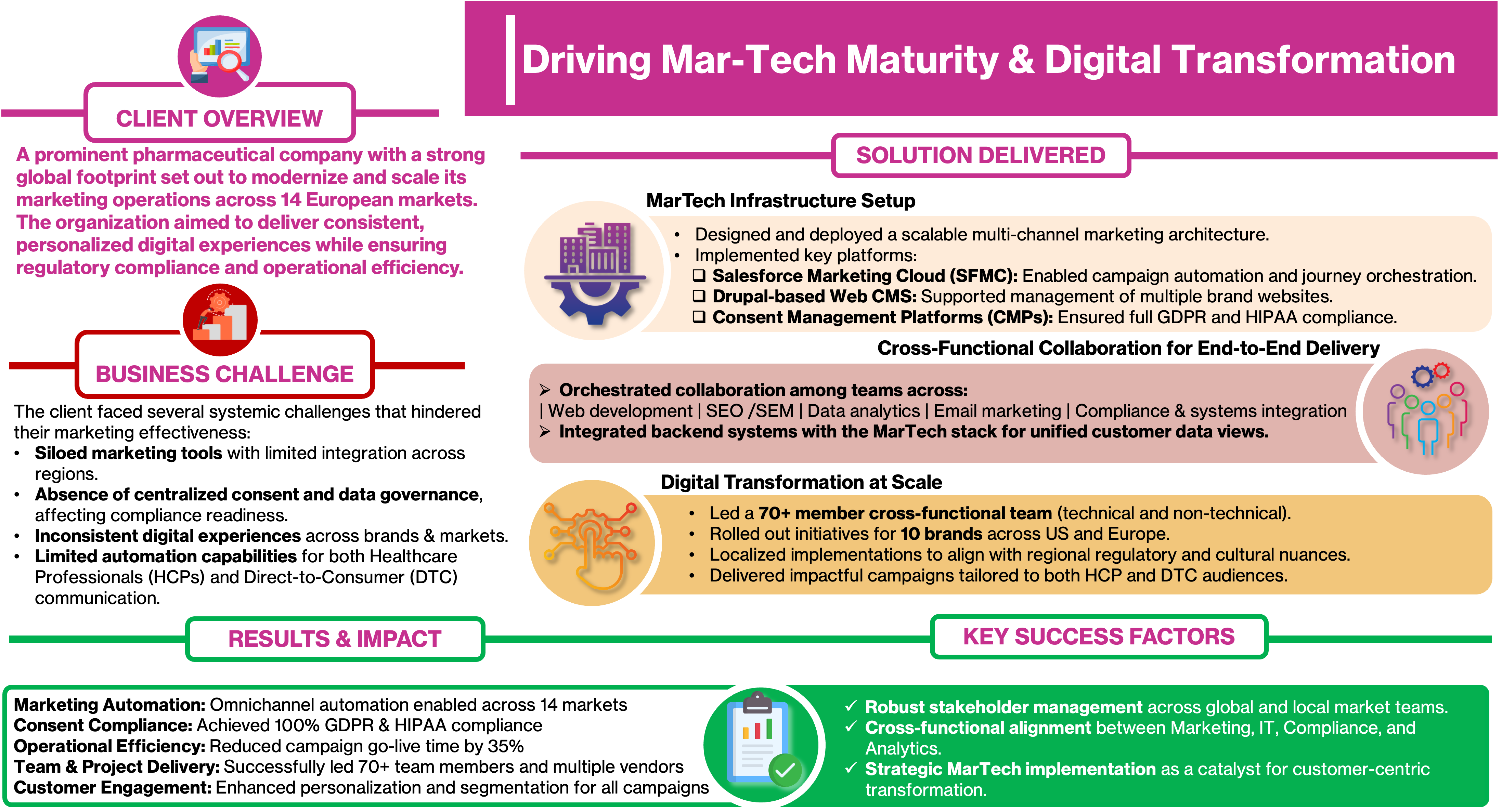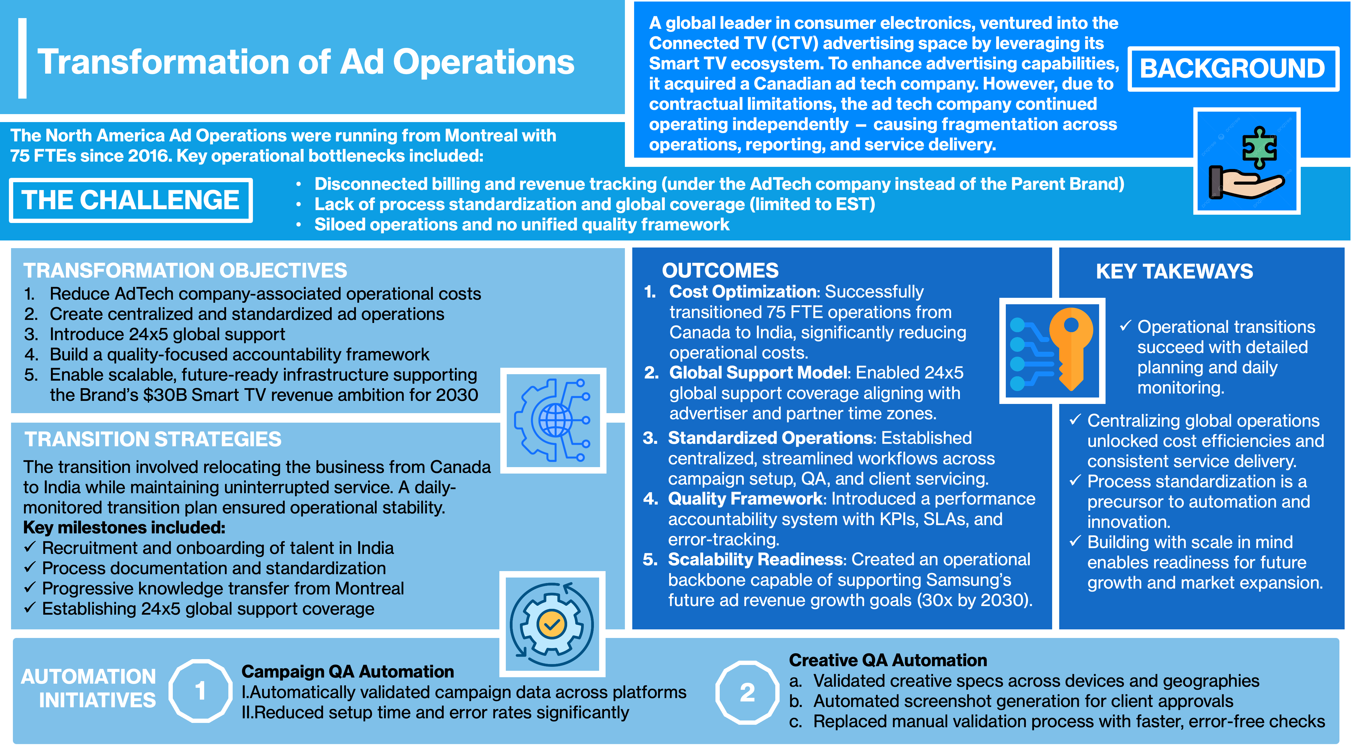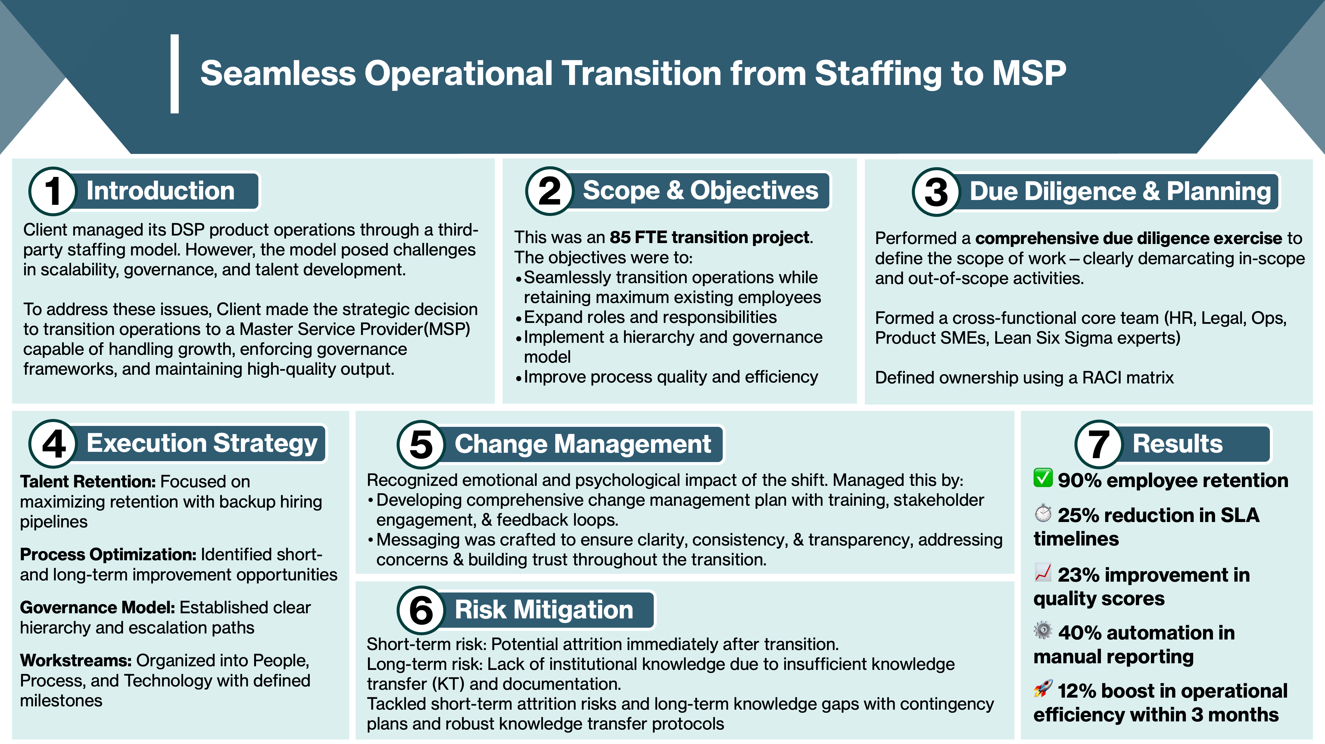 These case studies showcase how organizations transformed operations by strengthening people, process, and technology. They highlight journeys from staffing-to-MSP transitions, offshore integration, and MarTech modernization to automation, AI-driven insights, and proactive communication frameworks.
