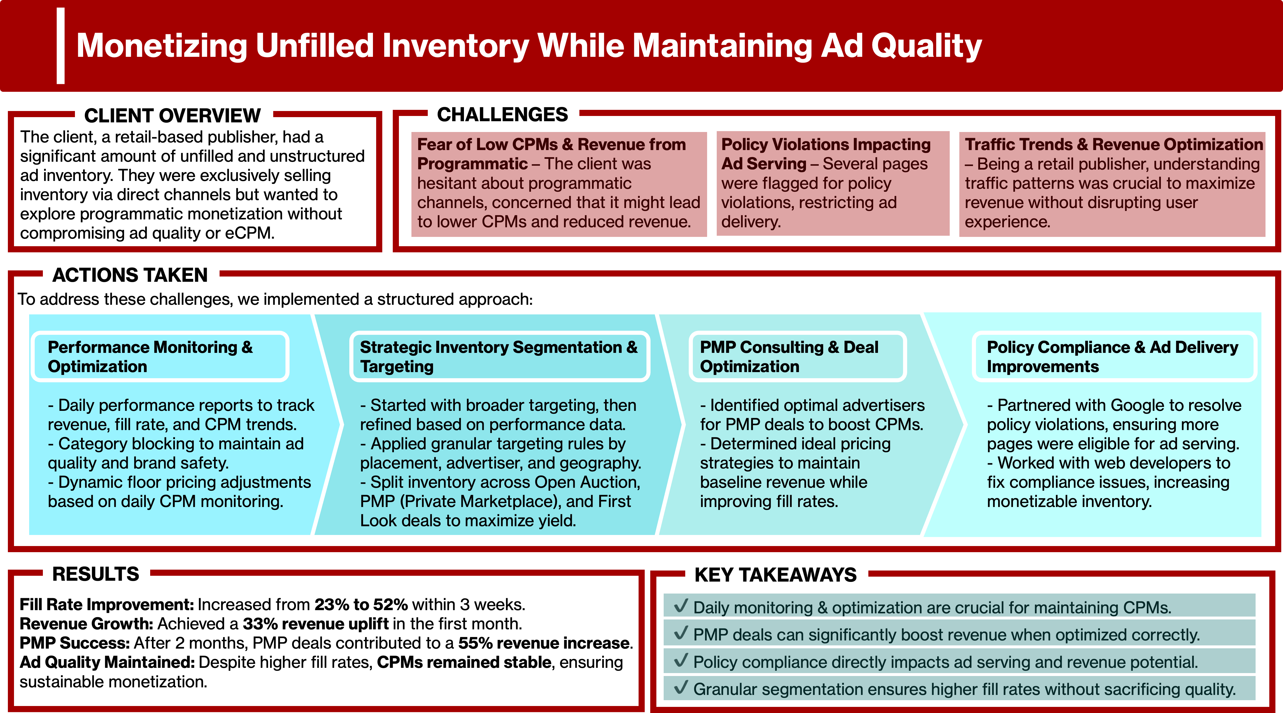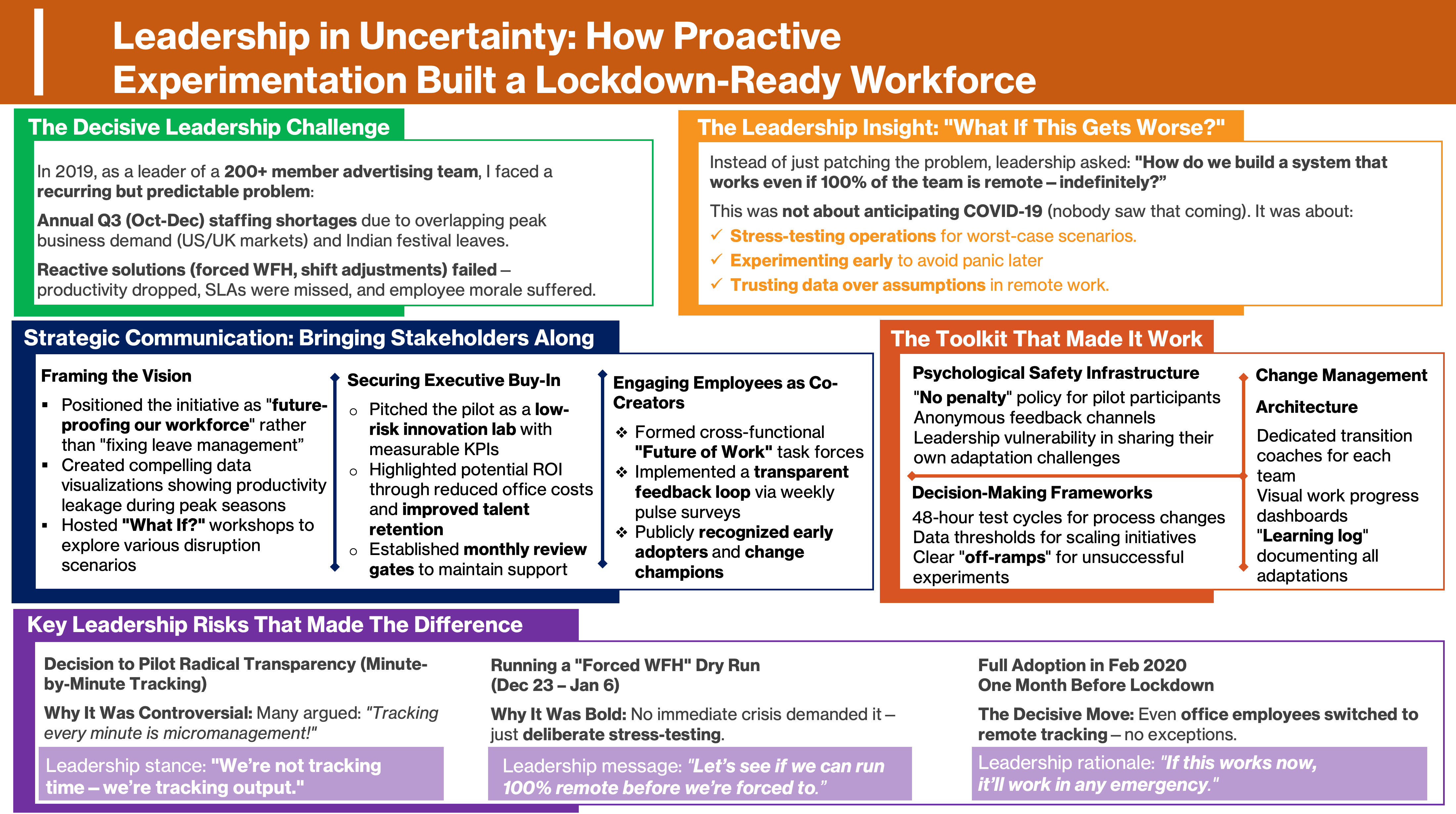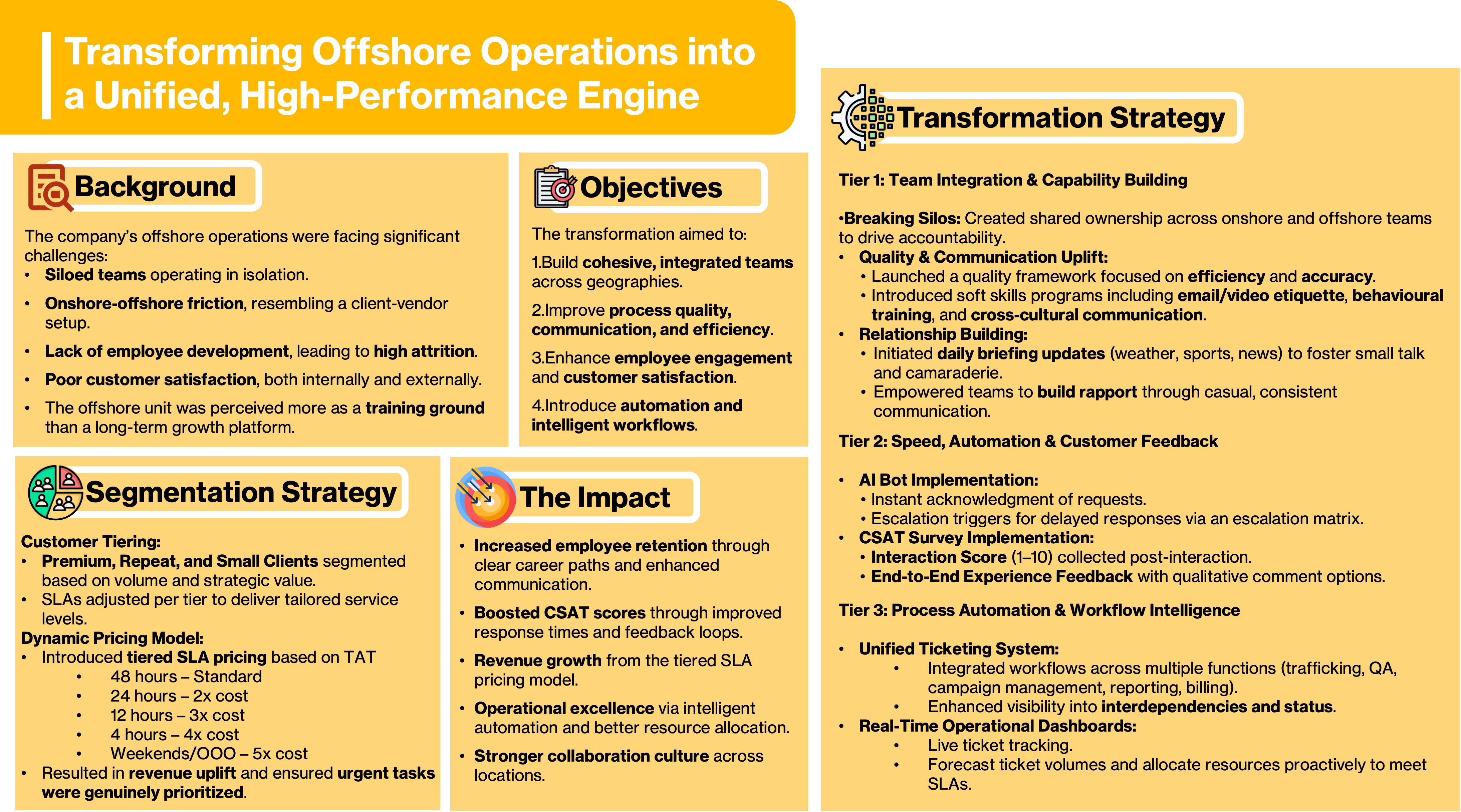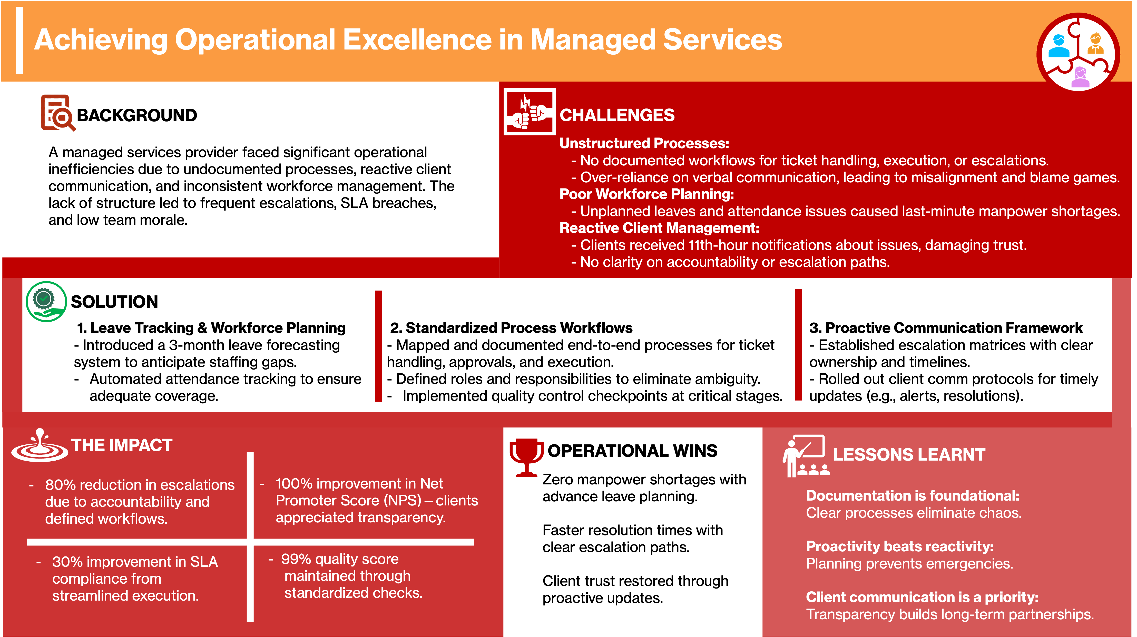 These case studies showcase how organizations transformed operations by strengthening people, process, and technology. They highlight journeys from staffing-to-MSP transitions, offshore integration, and MarTech modernization to automation, AI-driven insights, and proactive communication frameworks.
